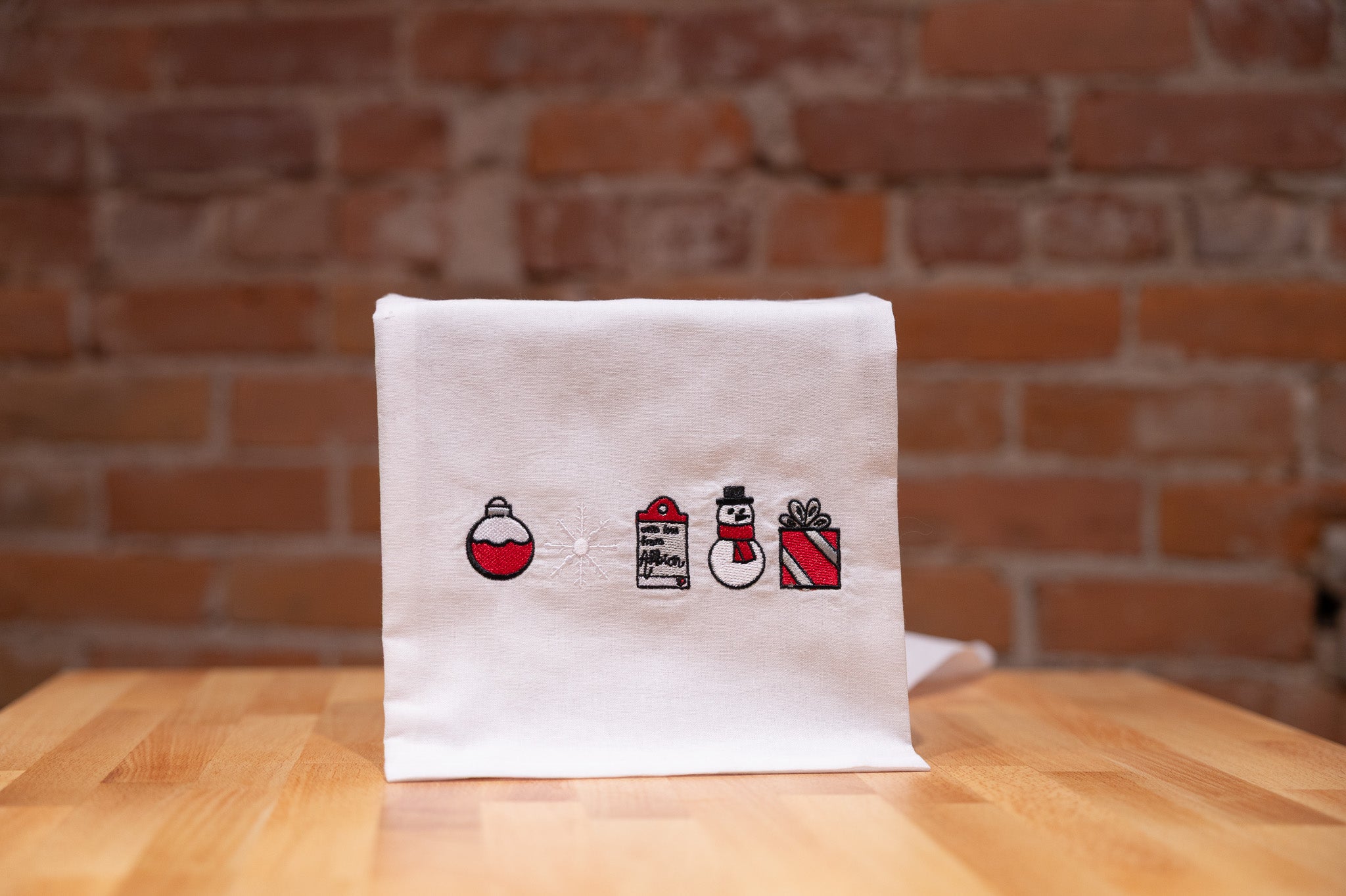 Bring your holiday cheer to the kitchen with a decorative Holiday Tea Towel, hand drawn by Cassidy Porter and embroidered in-house!