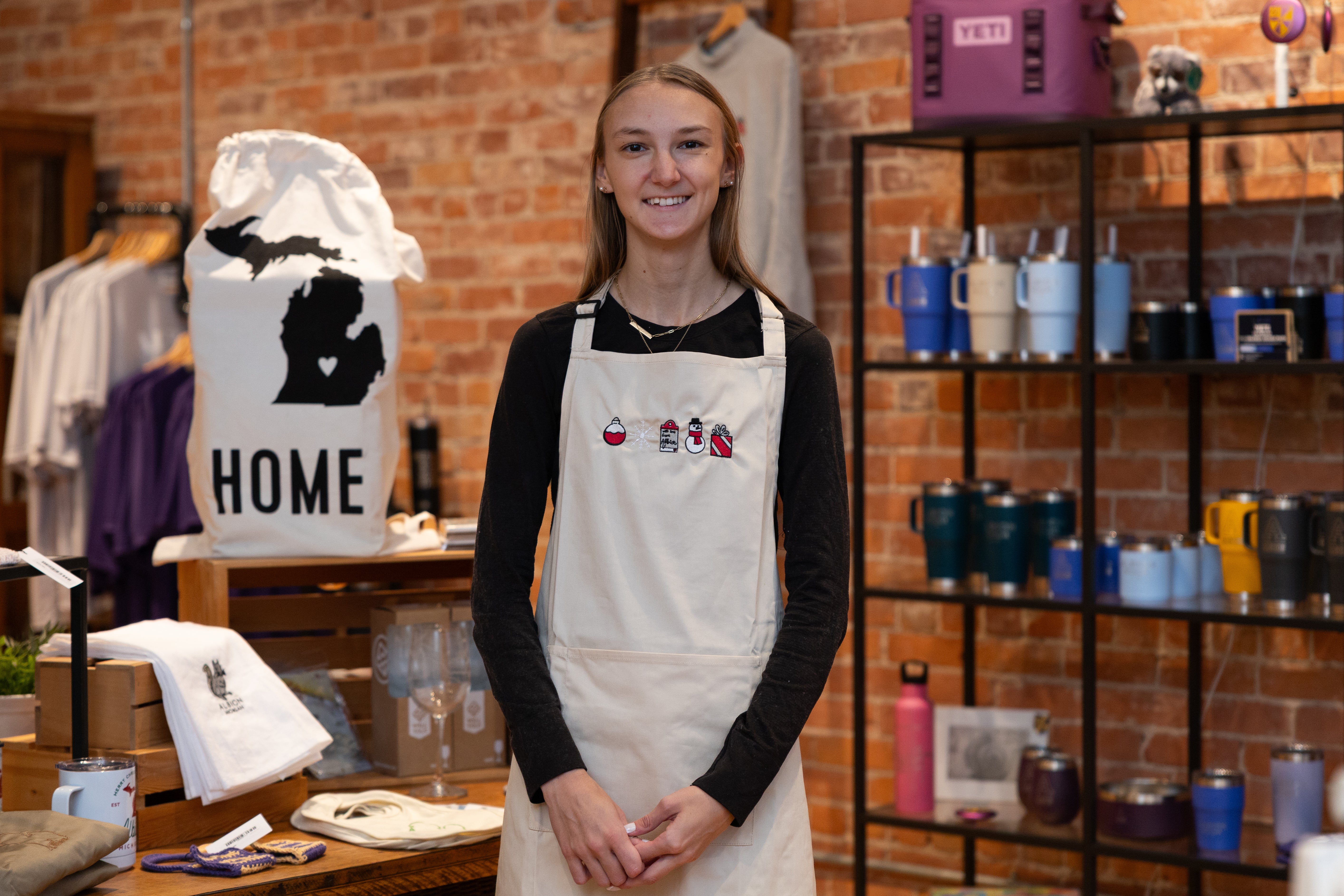 Whether you're baking holiday cookies or hosting a party, stay festive with a Holiday Apron! This design was drawn by Cassidy Porter and embroidered in-house.